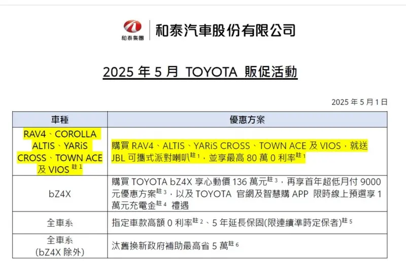 2025年4月,和泰Toyota指定車款升級市值1萬3千元的JBL車內音響。本(5)月促銷再加碼,贈品的價值更高!指定車款贈市值19,800元的JBL攜帶式藍芽喇叭。再享最高80萬0利率,詳見下圖。