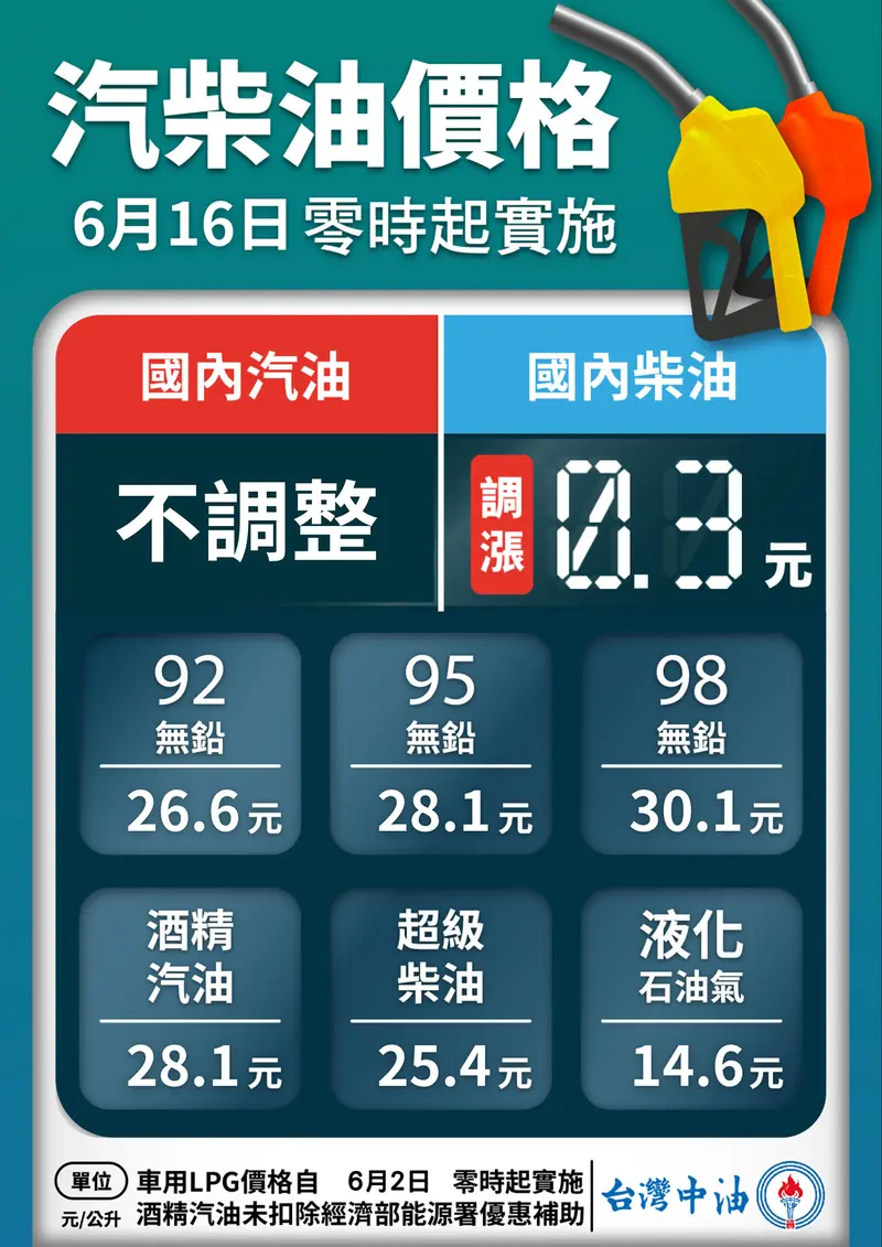 油價快訊|20250616(一)0點起|汽油凍漲 柴油調漲3角