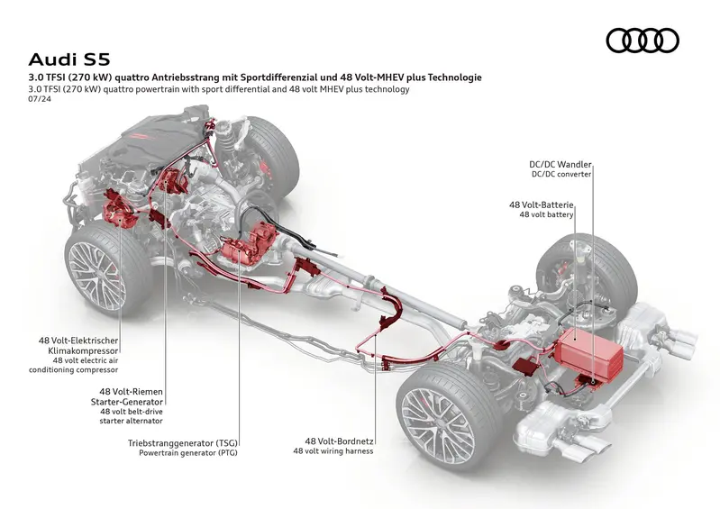 本文主角S車款,延續V6引擎(原廠代號EA839),首次輔以48V MHEV plus輕油電的3.0升V6引擎,雙車型的輸出同為361匹/50.9公斤米,零百加速時間與極速皆為4.5秒與250km/h。舊款輸出為354匹/50.9公斤米,零百加速轎車為4.7秒 ,旅行車為4.9秒,極限速度統一為250km/h。比較不同的是變速箱,B10世代改用七速雙離合器變速箱,而舊款為八速手自排變速箱。據信,性能取向的RS車款,將繼續使用EA839 V6雙渦輪增壓汽油引擎,並輔以可電動馬達與引擎同步驅動車輛的PHEV動力。