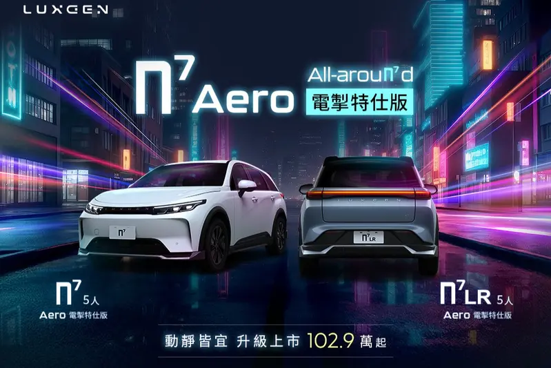 Luxgen今(1)日正式推出基於n7 5人座,以及n7 LR長里程5人座車款打造的Aero電掣特仕車,升級專屬LuxAero電掣套組(包含前/後擾流)、LuxAero導流尾翼、懸浮式輪圈蓋、車載充等配備,建議售價依序為102.9、127.9萬元起。另,Luxgen響應政府,本月品牌全車系適用「頭款5萬元」輕鬆入主專案。