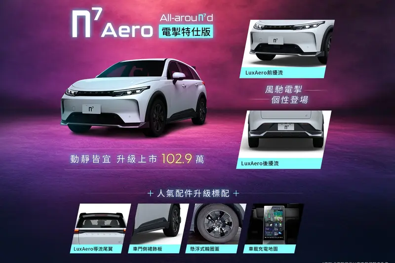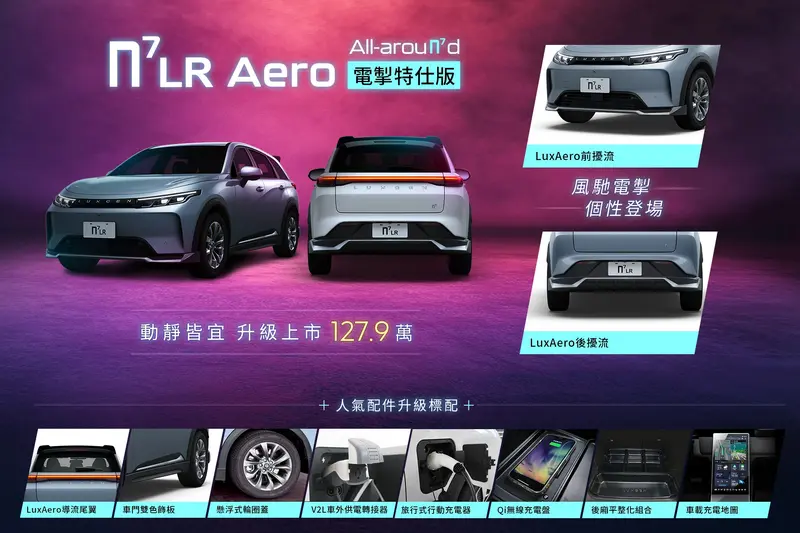 另提供長里程的n7 LR 5人Aero 電掣特仕版(售價127.9萬),標配LuxAero電掣套組(前/後擾流)、LuxAero 導流尾翼、懸浮式輪圈蓋、車載充電地圖、雙色車門飾板、V2L 車外供電轉接器、旅行式行動充電器 Plus、無線充電盤與後廂平整化套件(價值6.73萬元),機能再升級,是純電生活一步到位的滿配首選。