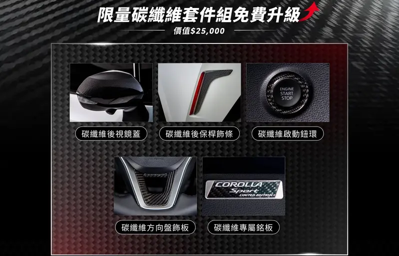 COROLLA SPORT | 本月入主COROLLA SPORT限時免費升級跑格碳纖維套件組 |