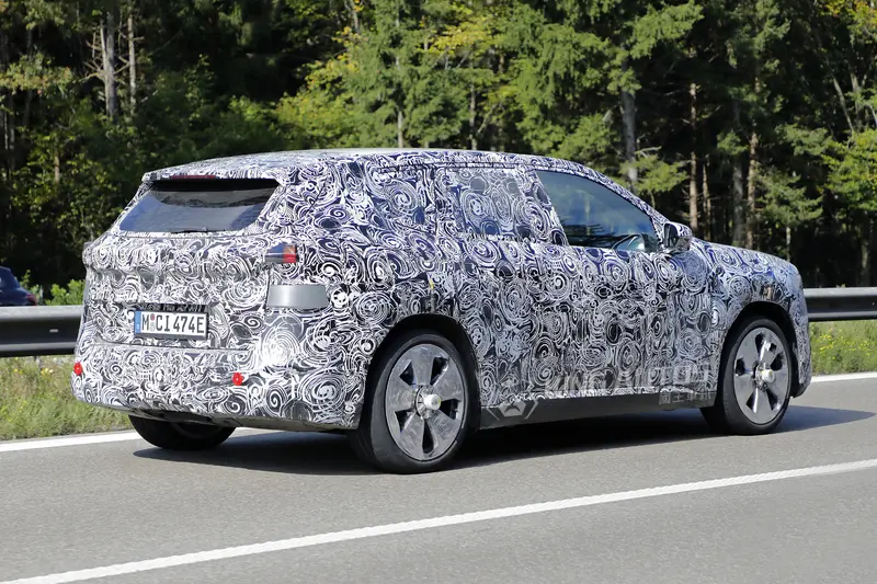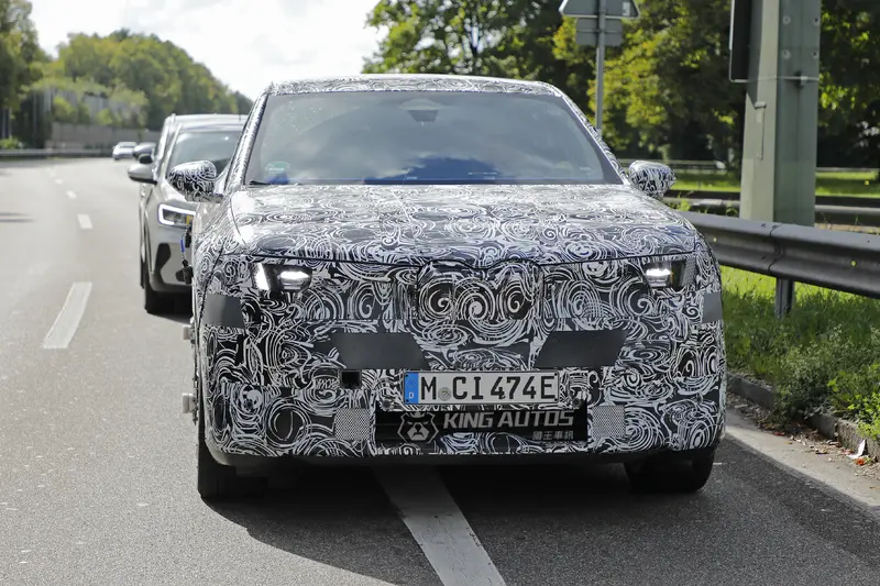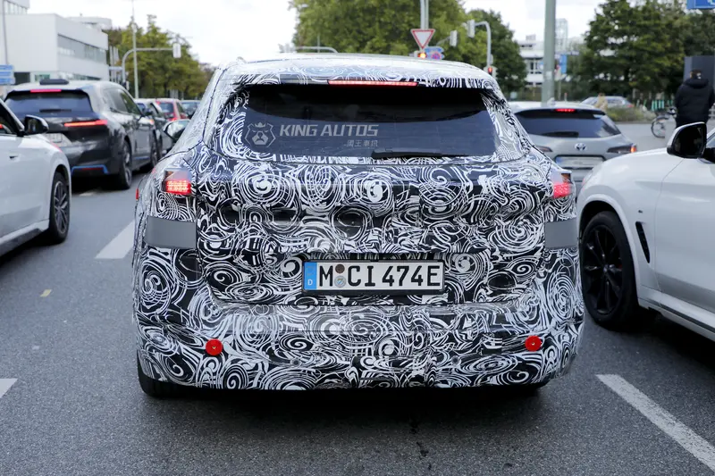與目前市售中的iX1相比,新款的輪廓有所變化,因此這不僅僅是簡單的小改款,而是全新的前後設計。特別是固定式後柱窗的頂部邊緣尤為明顯,它不再像現行款iX1那樣急劇下傾,而是保持了更水平的姿態。另一個明顯的特徵是車頭的風格,其設計靈感源自新款BMW iX3,車頭中央的窄橢圓形格柵和現代化的頭燈看起來就像是跟iX3同個模子印出來。
