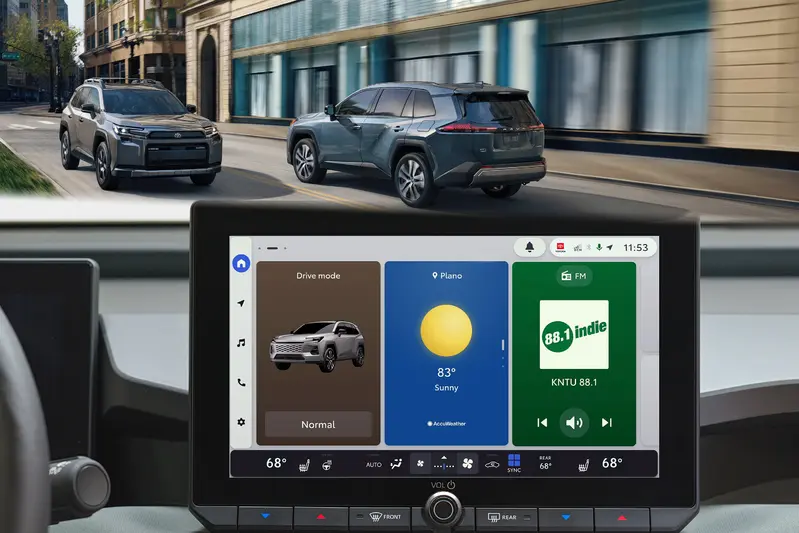 美規六代RAV4依照車款等級提供10.5或12.9吋中控螢幕,雖然尺碼大小不同,但都是同一套Enhanced Toyota Audio Multimedia車機系統,將為駕駛帶來清晰的畫面(編按:官方沒公布解析度)和便於使用的操作介面。此外,設備本身運算能力也有所提升,畫面切換將更為流暢。主畫面切分成直立式的三大區塊,可同時顯示導航、天氣等多項行車相關資訊。