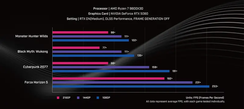 作為效能參考,搭載 AMD Ryzen™ 7 9800X3D 與 RTX™ 5080的 MPG Infinite Z3 X3D,在《電馭叛客 2077》(Cyberpunk 2077)中以 3840x2160 解析度、RTX 中等設定、DLSS Performance 模式與 Frame Generation 4x 開啟 的情況下,平均可達 239 FPS。透過 MSI 獨家 X3D Gaming Mode(可於 BIOS 中啟用),效能可依遊戲優化程度提升2%至20%不等。此系統在《魔物獵人 荒野》、《黑神話:悟空》與《極限競速:地平線 5》等熱門遊戲中皆能維持高幀率穩定表現。