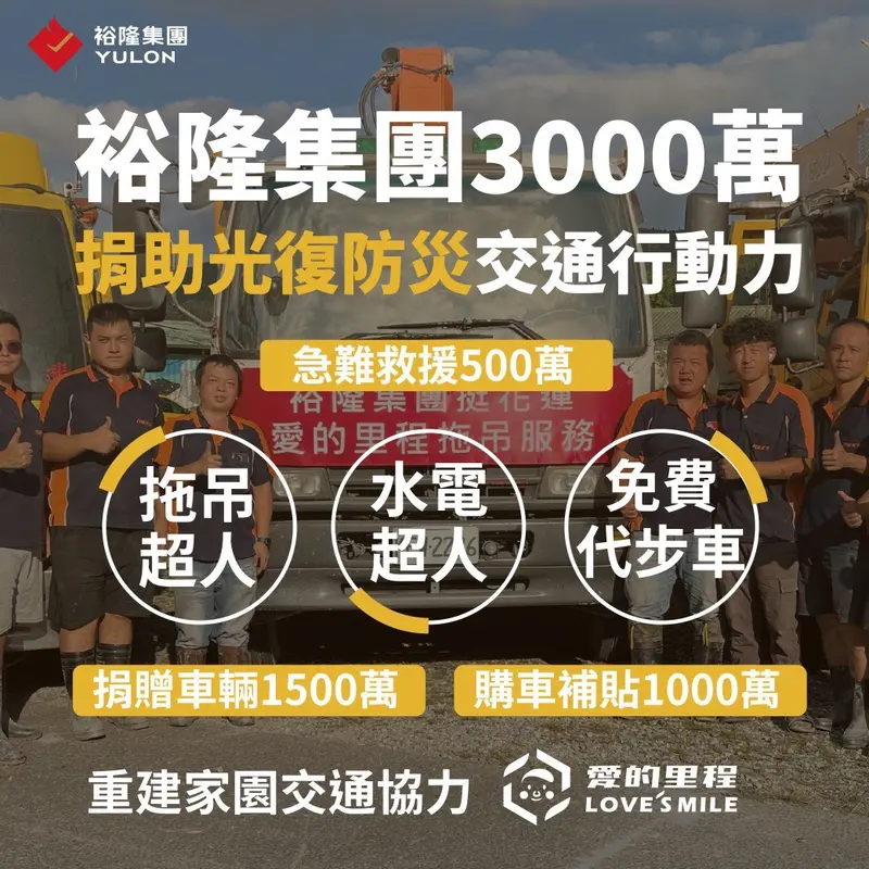 裕隆集團愛的里程公益平台長期致力於社會交通韌性的建立,集團此次攜手裕隆汽車、中華汽車、台元紡織、裕融企業,發揮汽車產業的核心能力,投入「花蓮光復災後重建行動力計畫」實質捐助3000萬元,由集團旗下中華汽車支應1000萬元(捐贈車輛/災民優惠購車方案)、裕隆汽車捐助1000萬元(捐贈車輛/災民優惠購車方案)、台元紡織500萬元(捐贈車輛)、裕融企業500萬元(捐助格上移動服務方案:拖吊、代步車等)。
