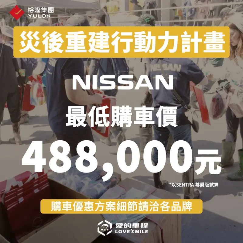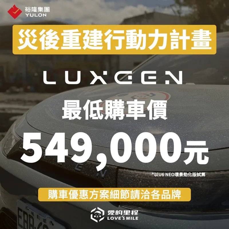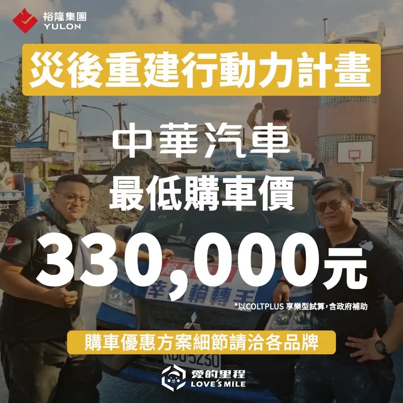 此外,鑒於花蓮光復鄉洪災造成大多數民眾車輛泡水報廢,未來仍有交通購車需求,裕隆集團旗下中華汽車、裕隆汽車、台元紡織提撥1500萬元,用以實質捐贈,預計捐出15台集團品牌車款,同時,中華汽車、裕隆汽車也提撥專款1000萬元,提供光復鄉受災車主選購中華三菱、NISSAN車系以及LUXGEN車系的的專屬優惠購車方案。補助災民中華三菱最低購車價近33萬,NISSAN最低購車享48.8萬,LUXGEN購車最低價54.9萬,協力降低災民移動上的負擔。