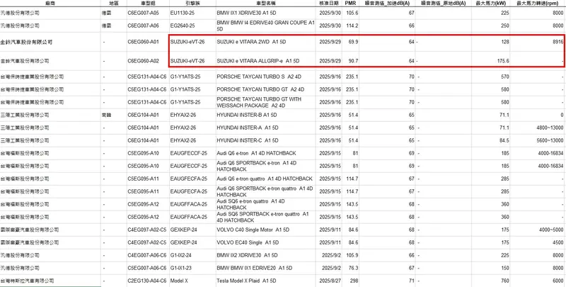Suzuki Taiwna將在年底的2026台北車展發表品牌首款純電休旅車Suzuki e Vitara,從最新的送測資料中可以發現,台灣將導入61度大電池容量車款,並比照油車Vitara,提供單馬達前驅與雙馬達四輪驅動車型。能降低車系價格帶的入門前驅車(49度電池、106kW輸出)沒出現在名單中。