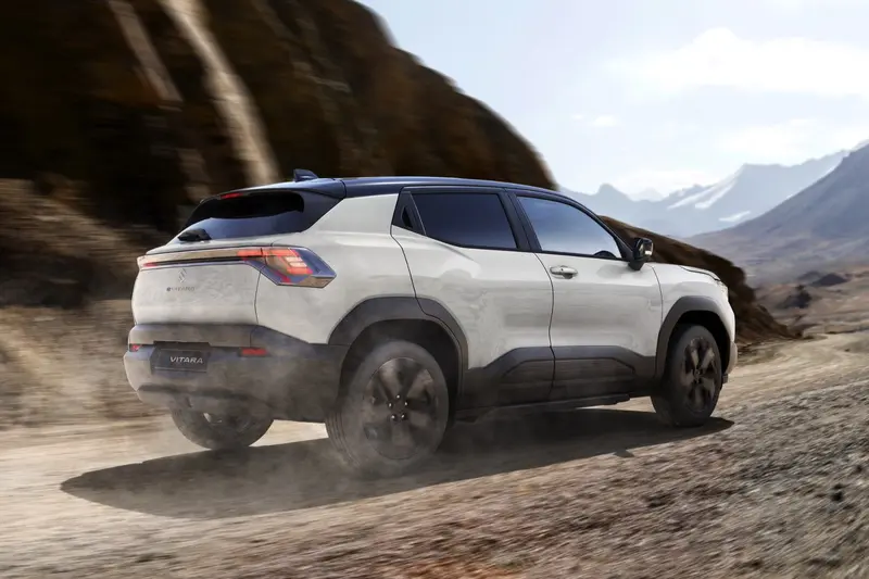 e Vitara尺碼為4,275*1,800*1,635mm,軸距較油車拉長200mm,來到2,700mm。車身重量方面,前驅為1,702公斤,雙馬達四輪驅動車款最重車型則來到1,899公斤。外觀基本上延續Suzuki eVX純電概念車的設計語彙,延續將後車門把手隱藏在C柱上的設計,車輛下擺的塑膠防刮飾條與概念車一樣厚實,是為了越野時防刮所設計。量產車除了頭燈變得比較務實一點外,基本上沒啥差別。