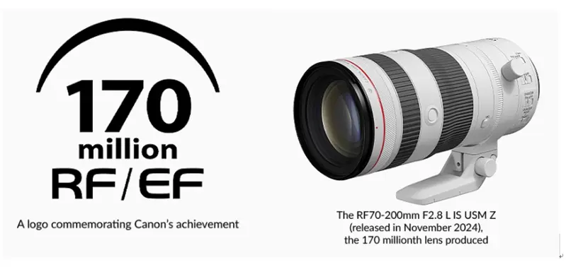 Canon 宣佈截至 2025 年 10 月,Canon EOS 系列 RF 及 EF 可交換鏡頭全球生產累計達到歷史性的 1.7 億支,刷新了可交換鏡頭的全球生產紀錄[1]。Canon 鏡頭生產的里程碑,從 1995 年可交換式鏡頭產量突破 1,000 萬支;2009 年突破 5,000 萬支;2014 年產量突破了 1 億支;時至今日,截至2025年10月,累計產量突破 1.7 億支並刷新世界紀錄。而具有里程碑意義的第 1.7 億支鏡頭為 RF70-200mm F2.8 L IS USM Z。