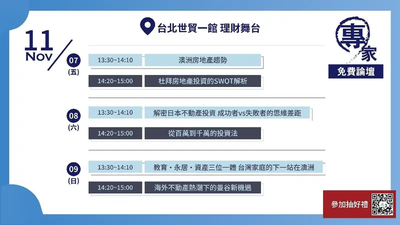 今年參展國家橫跨亞洲、歐洲、美洲與中東等十多個市場,各國開發商、地產顧問與移民專業機構,將帶來最新的物件、政策與相關資訊。TIEE台灣國際房地產博覽會同時也是知識交流平台。今年規劃六場「國際房產趨勢說明會」,主題包含:移居後的法律風險、家庭購屋與教育系統整合、稅制變動等熱門題目。同時也邀請多位專家、資深仲介與自住買家現身說法,帶來貼近生活的實戰經驗,幫助民眾做出更具信心的選擇。