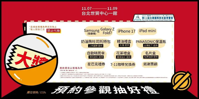 值得一提的是,TIEE台灣國際房地產博覽會也規劃出豐富互動體驗。完成線上預約並到場參觀的民眾可參與現場抽獎活動,獎項包括Samsung摺疊手機、iPhone、iPad、禮券等數十項好禮。此舉不僅提升展會參與度,也讓民眾在吸收資訊之餘享受豐富回饋。