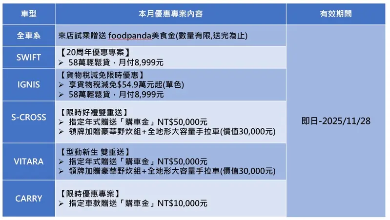 2025年11月購車優惠|54.9萬起入主SUZUKI IGNIS!享貨物稅減免+試乘再送foodpanda美食金