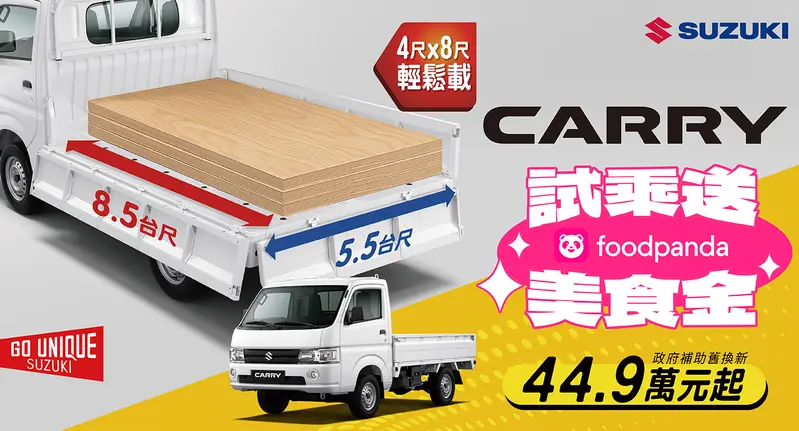 CARRY 長年在台灣市場受到職人肯定,不僅擁有強勁耐用的底盤設計,搭配高實用性的貨台與 SUZUKI 一貫的品質保證,是您事業上的得力夥伴。限時優惠、錯過可惜!歡迎洽全台 SUZUKI 商用車經銷據點了解詳情!
