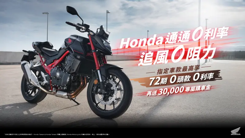 本月特別推出 「風格隨行 任性開騎」專案,Rebel車系低座高與流暢的動力輸出,深受展現自我個性的車主喜愛,11月訂購Rebel500、Rebel 1100,即贈送原廠左右馬鞍包套組,兼顧造型與實用性,讓旅途收納更輕鬆,完美融合率性風格與裝載便利性。搭載科技新潮流的CB650R E-Clutch以及CBR650R E-Clutch,以簡易、直覺的操作體驗,獲得市場熱烈迴響,享48期0頭款 0利率優惠,限時再送Shoei Z-8安全帽,讓騎士在享受騎乘樂趣的同時,也能兼顧行車安全與時尚風格。同時針對多款人氣機種提供超值的「通通零利率 追風零阻力」專案,全車系指定車款最高享72期、0頭款、0利率,不論是日常通勤、假日出遊或冒險壯遊,都能無壓力且無負擔入主Honda人氣二輪機種,享受專屬於騎士的馳騁自由。