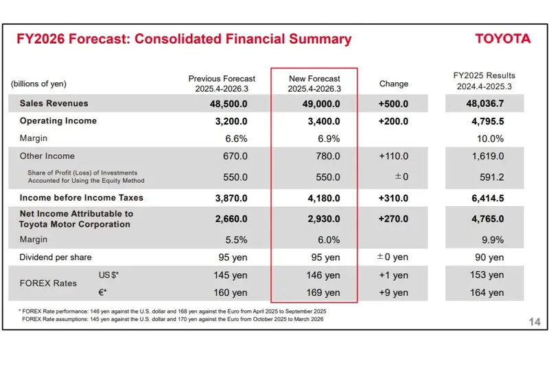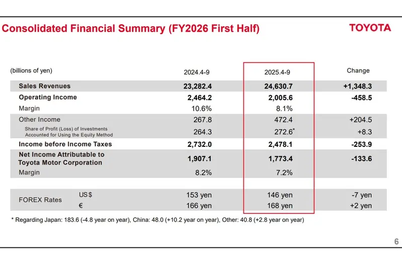 2025年11月5日,TCM公佈截至2026年3月的財年第二季(即2025年4月至9月,累計六個月)的財務表現。營業收入為24.6307兆日圓(較上年同期成長1.3483兆日圓,增幅5.8%),營業利潤為2.05兆日圓(較上年同期下降4,585億日圓,降幅18.6%)。總產量為 4,783,000 輛,比去年同期增長5.6%,其中電動車(泛指hev油電車、phve插電式油電車,以及bev純電動車等,以下同)的比例從44.4提高到46.9%。