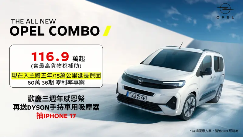 - 首批 OPEL COMBO 即將在 11 月中旬到港,預計 11 月底交車,於 11/5/2025 起至2/13/2026 三週年感恩祭期間入主 COMBO,可享有 60 萬 36 期低月付零利率與價值 9,900 的 Dyson 手持車用吸塵器,並加贈 5 年 15 萬公里延長保固。