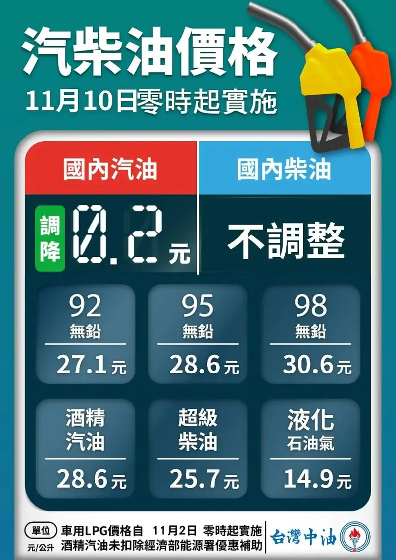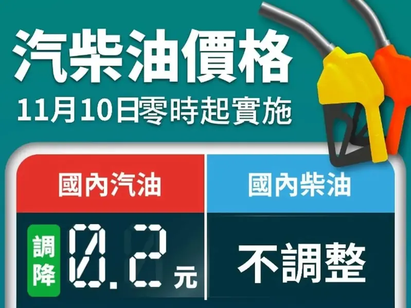 油價快訊|20251110(一)0點起|汽油降2角 柴油不調整