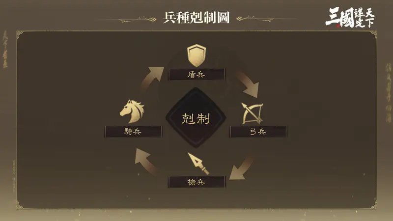 《三國:謀定天下》為每位武將量身打造專屬兵種設定,捨棄市面上其他SLG複雜的適性數值與繁瑣搭配,回歸最直覺、最純粹的戰場剋制邏輯。遊戲內建立「盾剋弓、弓剋槍、槍剋騎、騎剋盾」的經典兵種循環,讓玩家能夠迅速理解並靈活運用戰術優劣勢。再搭配屬性相剋與列傳羈絆等進階系統,使每一場戰鬥都充滿變化與深度,策略家們需依據戰局與對手調整部隊組合,方能在瞬息萬變的沙盤中謀定勝局。