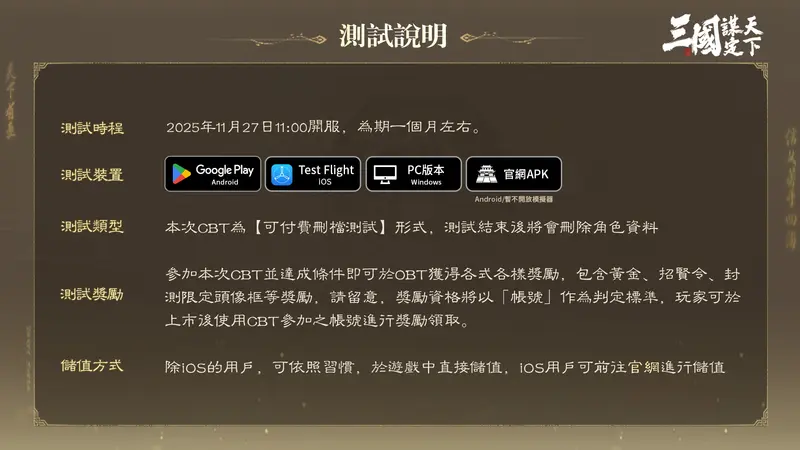 本次「帷幄測試」將預計於11月27日(四)上午11:00正式開服。屆時玩家可透過Google Play、App Store、PC版及官方APK 四種平台自由下載體驗。同時在「帷幄測試」賽季中,主公們將能率先體驗多項豐富多樣的遊戲內容,從職業養成、策略對戰到賽季劇本挑戰,盡享完整SLG謀略樂趣。機會難得,切勿錯過這場智謀與權謀交織的策略盛宴!