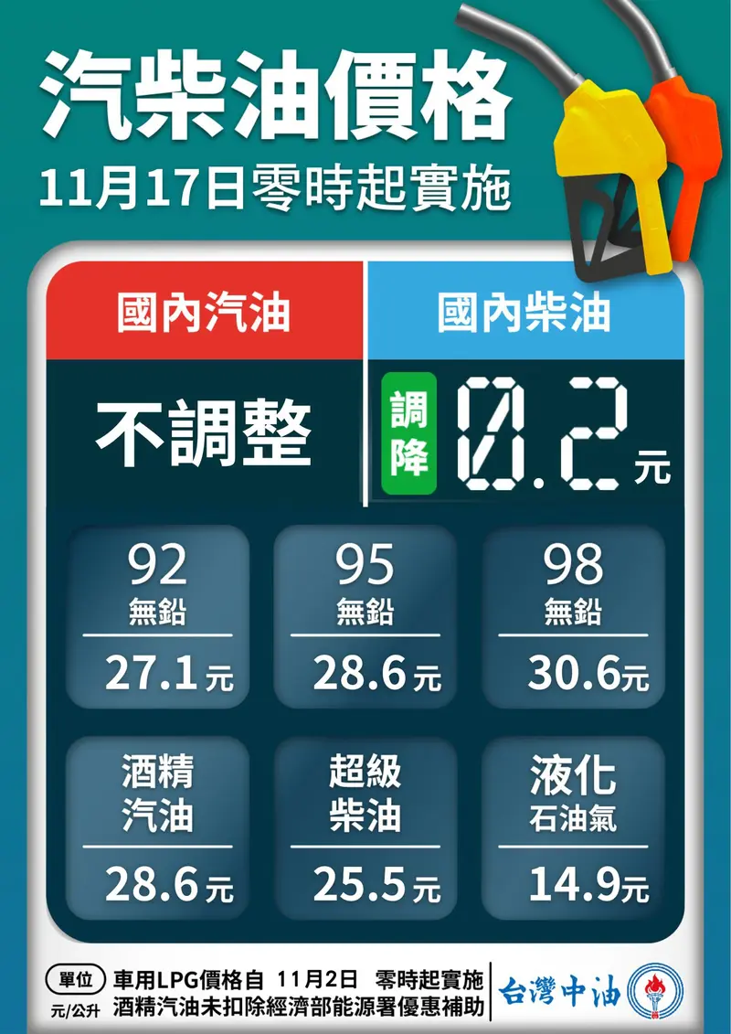 油價快訊|20251117(一)0點起|汽油不調整 柴油降2角