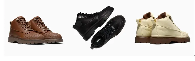 最初,CONVERSE是一家橡膠製品公司,主要生產靴子、涉水鞋和戶外鞋履,主打防護性能和實用性能,這核心基因從20世紀20年代延續至70年代末期;到了90年代,CONVERSE順應時興的戶外專業裝備融入街頭潮流的趨勢,推出MUD CHUNK。其模製橡膠鞋頭、分片鞋面與防滑大底設計,正是CHUCK TAYLOR經典設計語言與戶外實用屬性的完美結合。