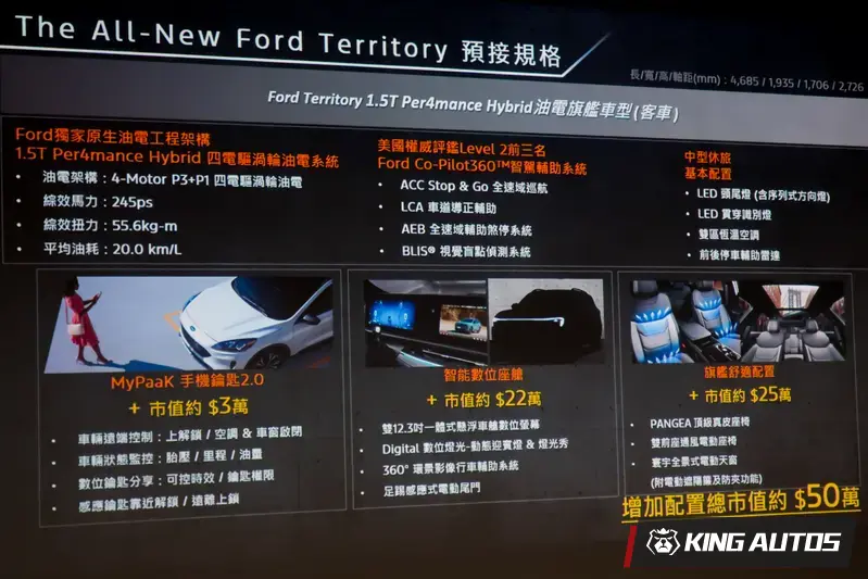 Ford Territory 1.5T Per4mance Hybrid四電驅渦輪油電系統,油電旗艦車型預接單價101.9萬(須扣除政府舊換新及貨物稅減徵共8萬元補助),配置市值超過50萬的豪華科技配備,包含:美國權威評鑑Level 2前三名的Ford Co-Pilot360TM全方位智駕科技輔助系統、MyPaaK手機鑰匙2.0、雙12.3吋懸浮數位螢幕、Digital動態迎賓燈光秀、360°環景影像、足踢感應電動尾門、雙前座通風電動座椅,以及寰宇全景電動天窗等,全面刷新同級標準,為台灣家用休旅市場帶來新世代渦輪油電動力新選擇。