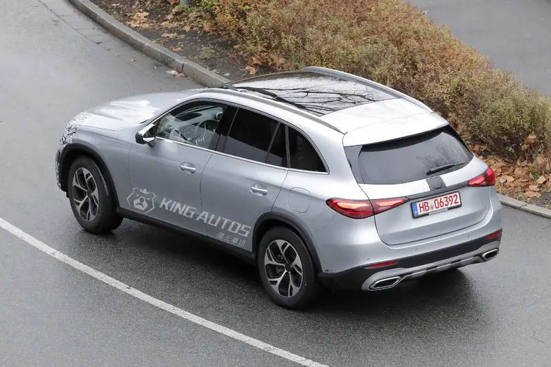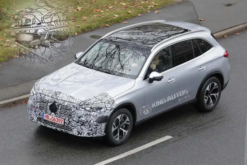 小改款GLC的車身樣式與現行款差不多,所以偽裝的並不多。更動主要集中在車頭造型,雖然覆蓋著厚重偽裝,但從車頭水箱護罩的輪廓來看,應該是換上純電GLC with EQ Technology相同的設計,車頭變成更挺立。車側沒有偽裝,黑色的側裙代表這輛測試車應該是沒有選配AMG Line套件;車外後視鏡有著細細長長的偽裝,遮住了小改款後新增的動態方向燈;車尾基本上與現行款相同,最大的差別於測試車把三芒星廠徽遮住了。足下的鋁圈對GLC車系來說是全新的,造型與現行款採用的五輻或多輻式差很多,感覺是亞洲車才會使用的鋁圈。