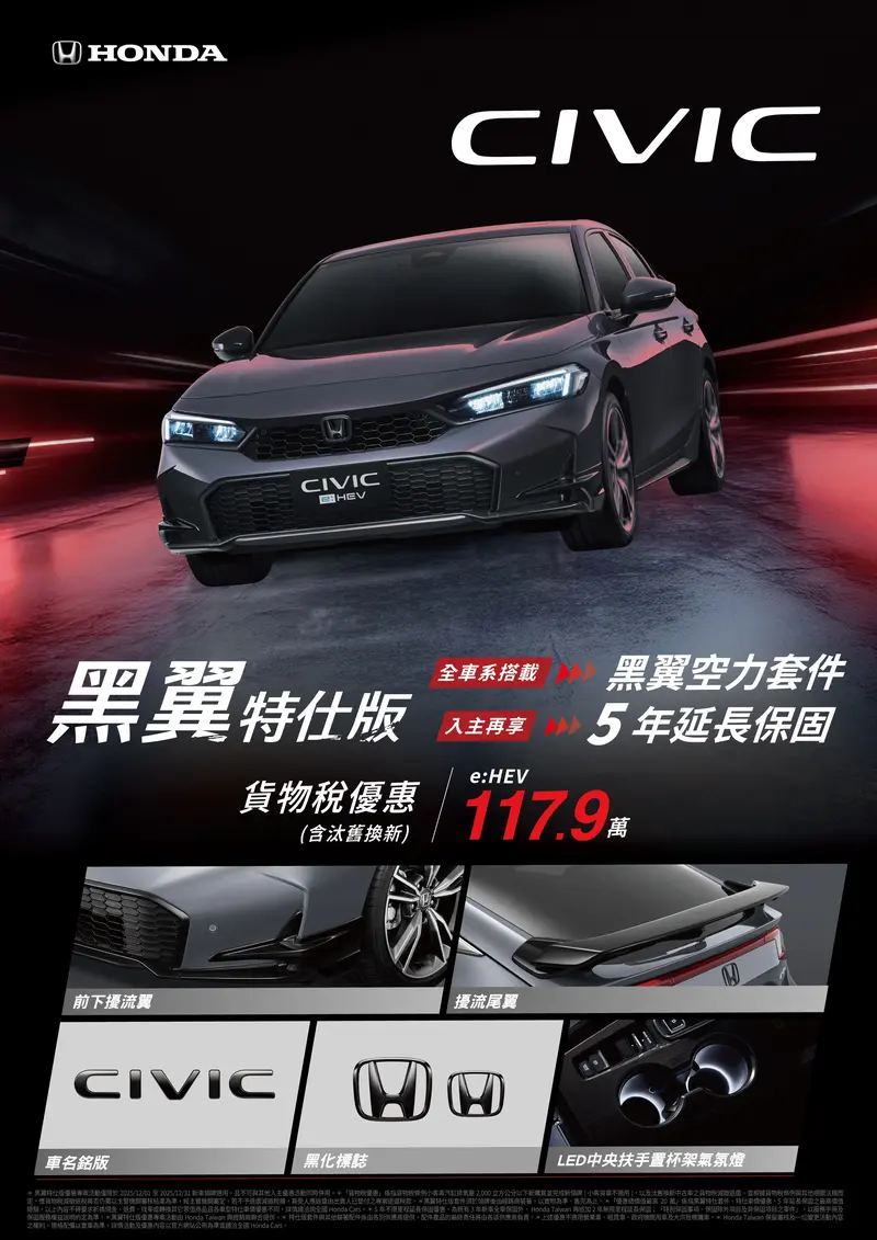即日起~2025/12/31止入主CIVIC e:HEV次世代電油車享「OVO便攜式智慧投影機*1」或「黑翼特仕版與5年延長保固*1」專案二擇一好禮,並可享貨物稅優惠(含汰舊換新)117.9萬元。其中空力套件組包含「前下擾流翼、擾流尾翼、CIVIC車名銘版、前後H黑化標誌、LED中央扶手置杯架氣氛燈」,成就買家獨具魅力的零里程焦慮駕乘體驗。