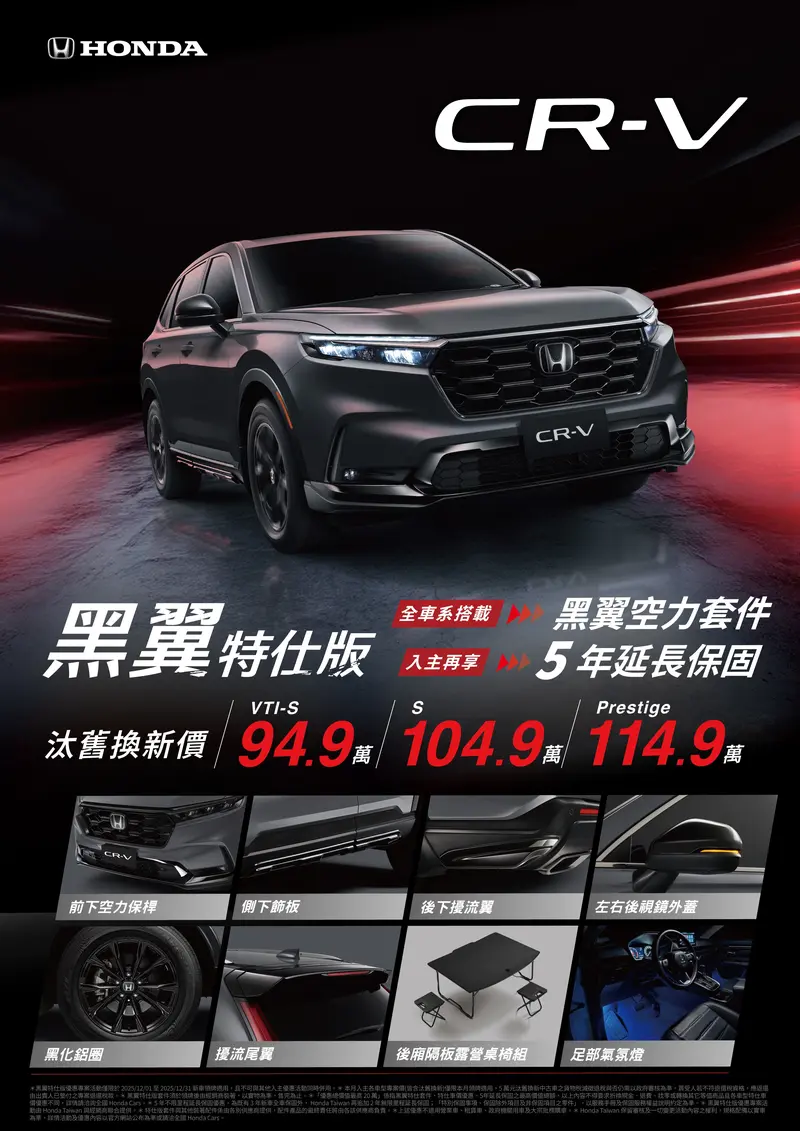 為感謝消費者對CR-V 30年來的一路支持,即日起~2025/12/31止入主CR-V享「OVO便攜式智慧投影機*1」,並可享汰舊換新價VTi-S 94.9萬元、S 104.9萬元、Prestige 114.9萬元優惠。針對追求動感跑格輪廓與運動化設定的消費者,入主禮可選「黑翼特仕版與5年延長保固」專案,其中特仕版內容為「前下空力保桿、側下飾板、後下擾流翼、左右後視鏡外蓋、黑化鋁圈、擾流尾翼、後廂隔板露營桌椅組、足部氣氛燈」,總價值最高達20萬元優惠,實現滿載全家人的移動夢想喜悅。