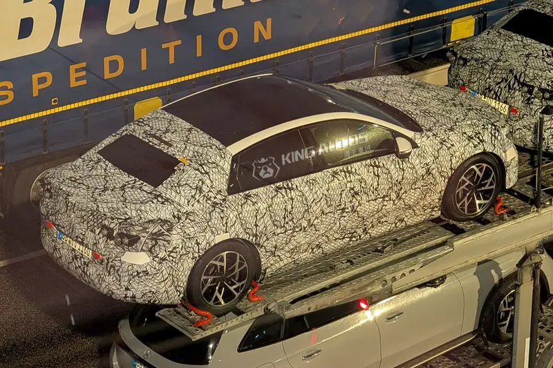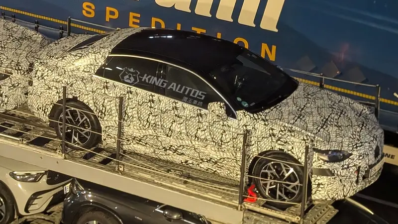 C-Class EQ的原型車近日現身德國基爾的碼頭,將出發前往芬蘭拉普蘭,在接下來的三個月裡進行最終的極端冬季測試,順便拍幾隻預告宣傳短片,為2026年7月的發表做好準備。雖然測試車包的密不通風,但我們可以從官方首張預告圖知道它的車頭與純電GLC electric共享Sensual Purity設計語彙,車頭有著復古的橫柵式仿水箱護罩,兩側頭燈融入三芒星意象。