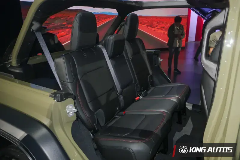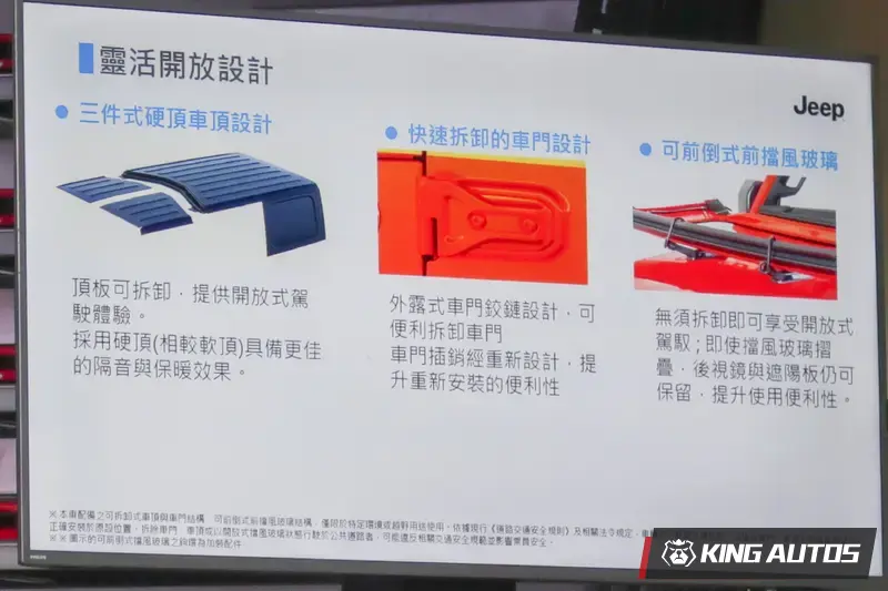 同時,為提升越野時的耐用度,Jeep Wrangler 將傳統外露天線改為隱藏於前擋風玻璃內,使外型更俐落,也避免林道樹枝勾扯,體現 Jeep 工程哲學的細節之一。Jeep® Wrangler 最獨特的開放式車體結構,包含可拆卸式車門、可拆卸式車頂與可前倒式擋風玻璃,更是至今仍無任何車輛能複製的設計。這些機制並非僅只是噱頭,而是 Jeep 對自由價值的具體詮釋:自由不是抽象概念,而是一種能以雙手拆下車門、迎向天地的物理行為。