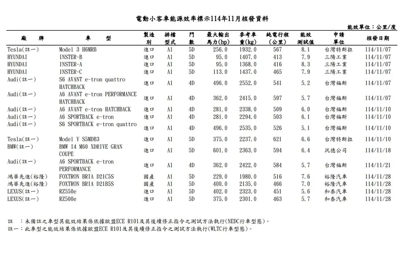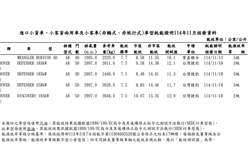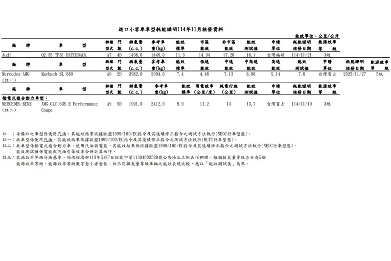 台灣經濟部能源署近日公布2025年11月核發資料,揭露年底重磅國產車Mitsubishi Xforce、Ford Territory,以及Foxtron首款電動車Bria的耗能;進口車方面則有不久前接單的Jeep Wrangler,以及性能、奢華取向的GLC 63 Coupe與Maybach SL680。