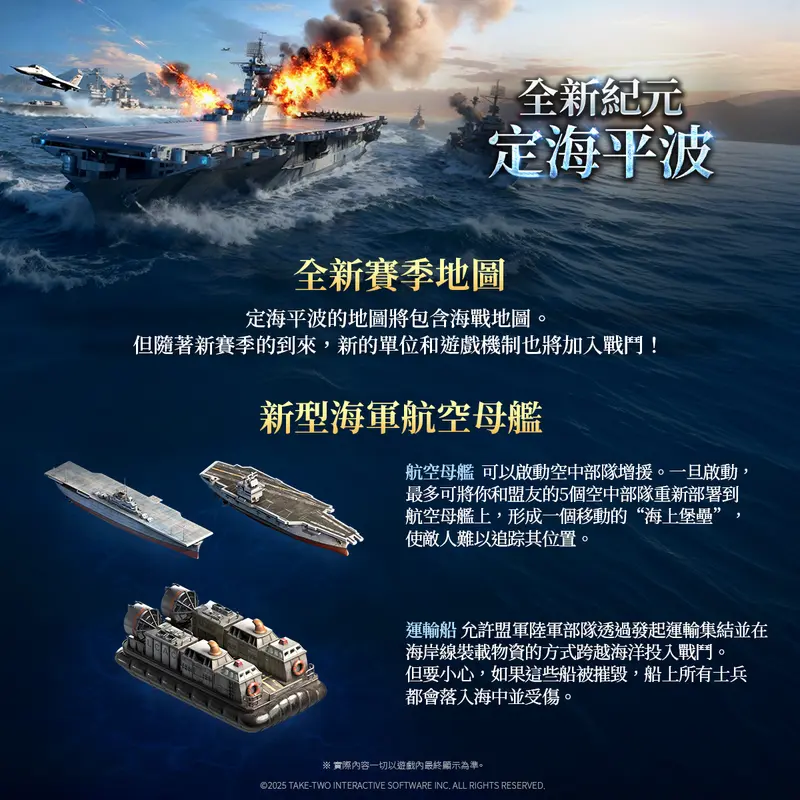 本賽季登場的「航空母艦」與「潛艦」將徹底改變海戰生態,海權爭奪將成為制勝關鍵:航空母艦作為海上移動堡壘,能搭載盟友的空軍單位進行長距離移動,大幅減少士氣損耗,讓空中單位具備更優秀的續航與作戰能力。潛艦則扮演戰場上的隱匿殺手,能無聲無息地從敵陣後方發動突襲,是徹底擊潰敵方防線與守軍的戰術利器。