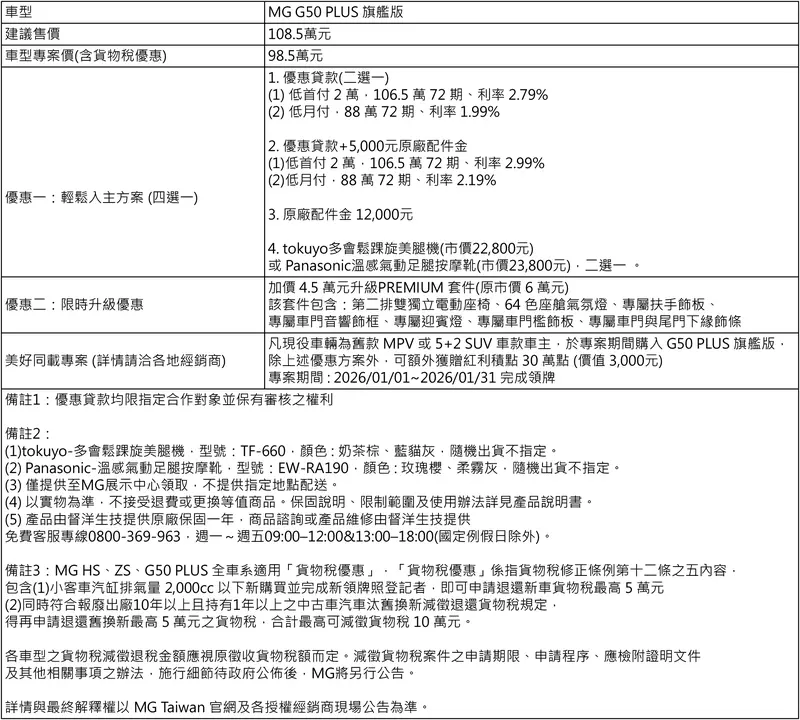 為回饋三明治族群,MG TAIWAN現正推出限定優惠方案(詳細內容請洽各展示中心)。搭配政府舊換新及貨物稅減徵,即可以百萬內入手,現在正是入主G50 PLUS的最佳時機。