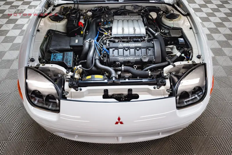 動力核心是著名的 3.0 升 V6 引擎(6G72),依版本提供自然進氣與雙渦輪增壓設定。其中最具代表性的 VR-4 車型搭載雙渦輪、四輪驅動,最大馬力隨年份從約 300 匹提升至 320 匹左右,並配置六速手排變速箱。加上四輪轉向(4WS)與電子控制懸吊,讓 3000GT 在高速巡航與彎道穩定性上表現出色,展現出強烈的「高速 GT 跑車」性格。