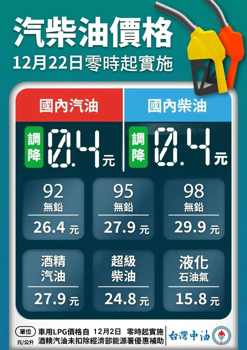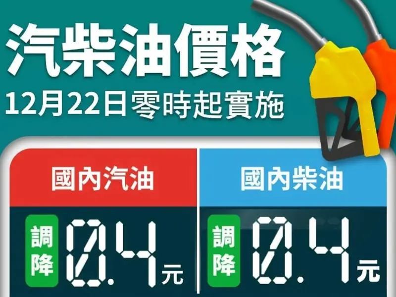 油價快訊|20251222(一)0點起|汽油降4角 柴油降4角