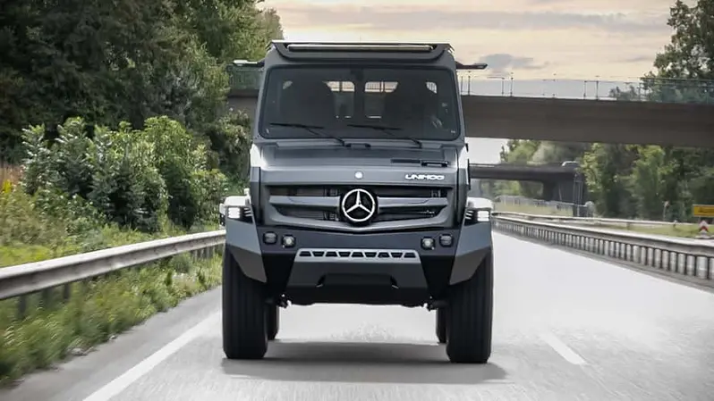 這款豪華版 Unimog 是由 Mercedes-Benz Special Trucks 與 Hellgeth Engineering 聯手打造,基礎來自 Unimog U 4023。核心結構幾乎原封不動,包含門式車橋、可大幅扭轉的車架、可選全輪驅動,以及前後軸縱向差速鎖,這些都是 Unimog 能在極端地形中橫行無阻的關鍵。
