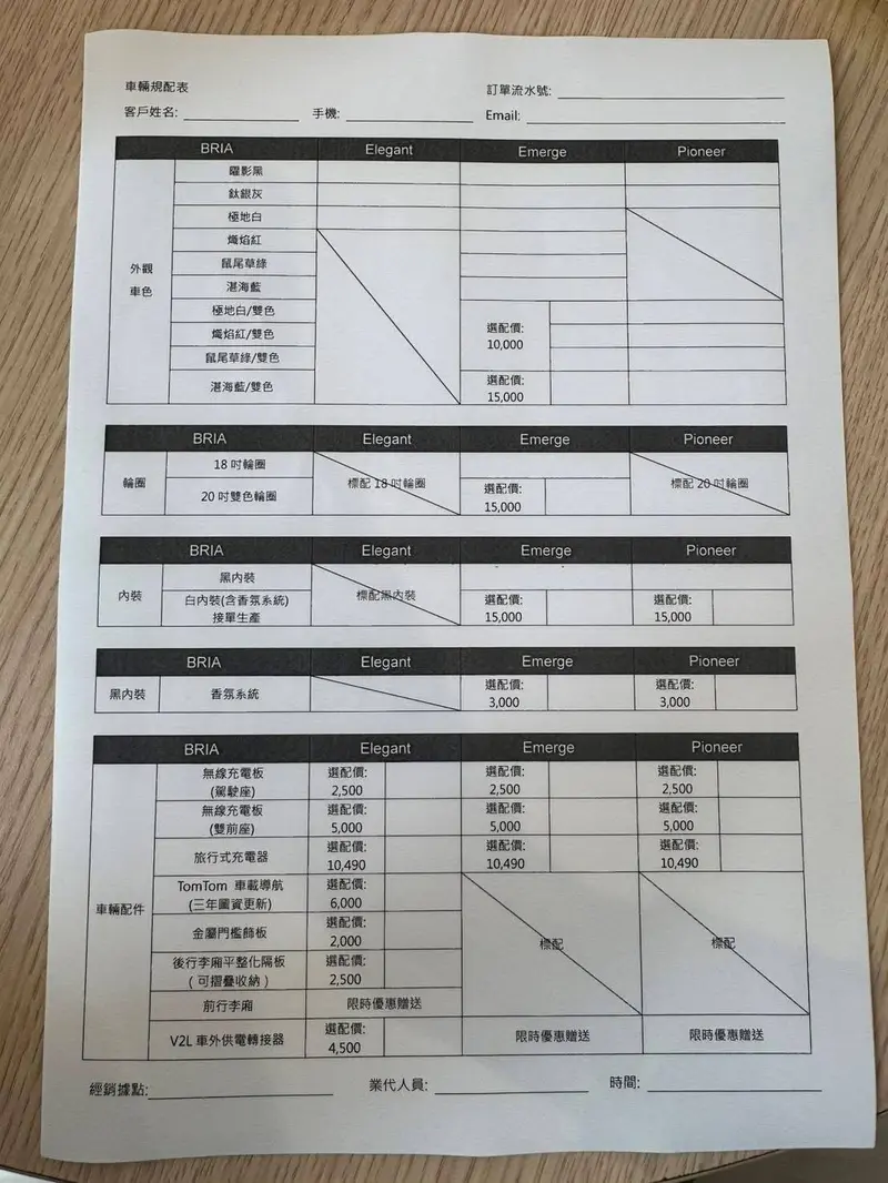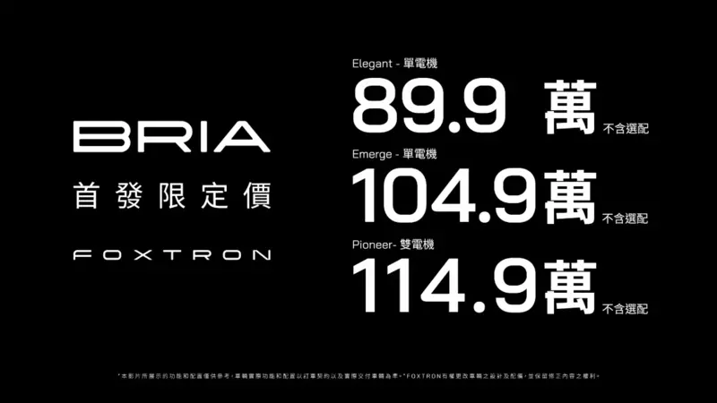 鴻華先進表示,透過品牌不僅可以直接面對市場、真實地去了解需求,更可以傳達平台化所帶來的使用者體驗,而「價值不需要被高估,但需要被看見」,在Bria上可感受到自主研發的投入及與國際合作所創造的使用者體驗與價值的產品表現,而實際價格希望讓台灣的消費者可以感受到對大家的尊重,綜合考量下,Bria共推出三種車型選擇,從入門款後輪驅動Elegant新台幣89.9萬元起到四輪驅動的頂規 Pioneer 114.9萬元起,滿足不同消費者需求。
