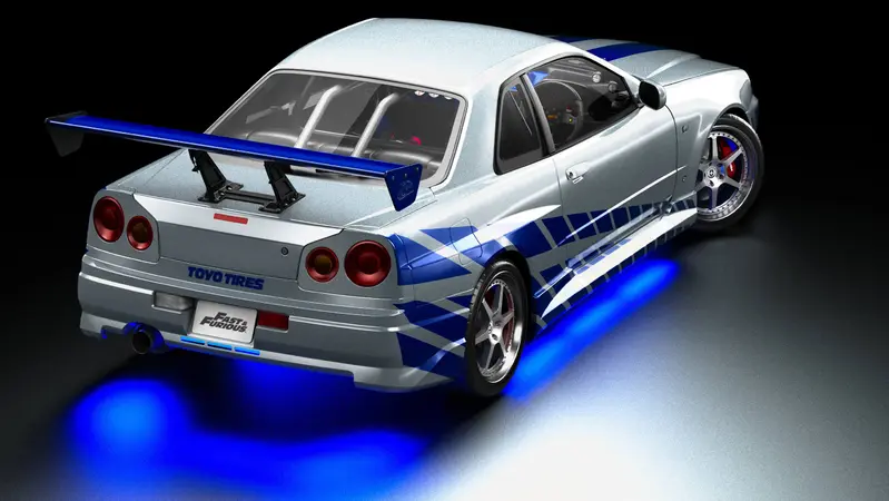 電影中的 R34 採用醒目的藍色車身搭配銀色條紋與側裙拉花,整體風格偏向當時流行的 JDM 賽車化改裝。加大的輪圈、降低的車身、激進的空力套件,讓這台 GT-R 在鏡頭中充滿速度與科技感。雖然實際拍攝時多為外觀改裝車與替身車,但電影成功塑造出「街頭最強四驅戰神」的形象,使觀眾深信它能在任何路況下碾壓對手。