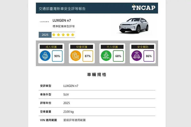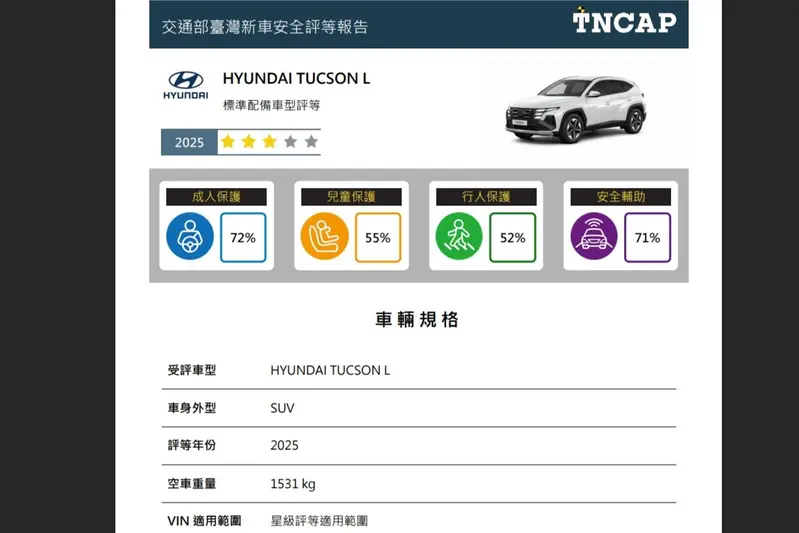 為提供消費者新車安全資訊,促使車輛產業升級,提升國內車輛 安全性,國內推動臺灣新車安全評等計畫(TNCAP),在完成 114 年第 四季四車型挑選、購置、試驗及評等相關作業後,今(29)日正式公 布 TNCAP 第七、第八順位受評車型的評等結果,HYUNDAI CUSTIN獲得四顆星,HYUNDAI TUCSON L 獲得三顆星,以及車輛業者自費 申請評等二車型的評等結果,TOYOTA YARIS CROSS 獲得四顆星, LUXGEN n7 獲得五顆星。