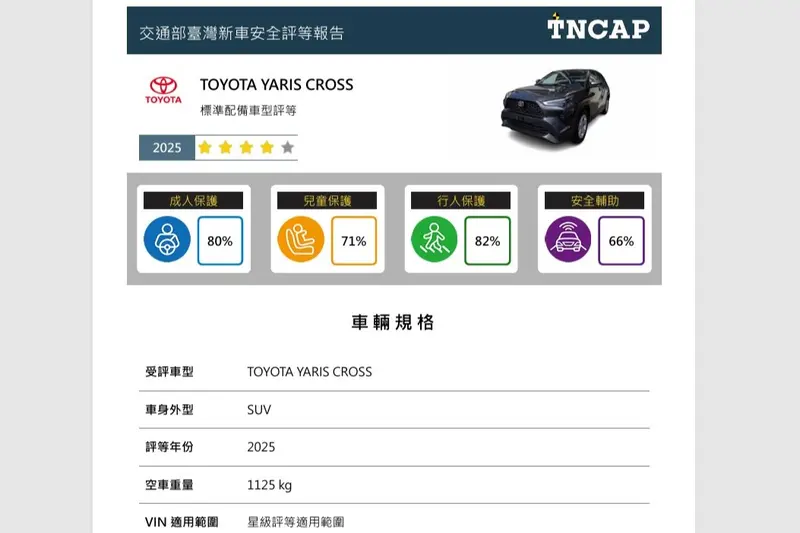 今(114)年 9 月 30 日公告三車型 TNCAP 評等結果後,財團法人車 輛安全審驗中心針對第四季四車型(HYUNDAI CUSTIN、HYUNDAI TUCSON L、TOYOTA YARIS CROSS 及 LUXGEN n7),依「交通部執 行臺灣新車安全評等作業要點」及「交通部臺灣新車安全評等規章」 執行 TNCAP 主動、被動安全評等試驗,辦理完成計分及轉換星級評 等,結果說明如下,其中 TOYOTA YARIS CROSS 及 LUXGEN n7 車 型首次分別選擇交通部新增指定的西班牙 IDIADA 及美國 CALSPAN 國外檢測機構執行試驗,國內外送測作法皆一致,均依 TNCAP 規章 辦理,展現業界對 TNCAP 制度的認同,亦代表 TNCAP 與國際作法接 軌,持續邁向國際化,本次揭露四車型評等詳細內容可至 TNCAP 專屬網站參閱相關安全資訊