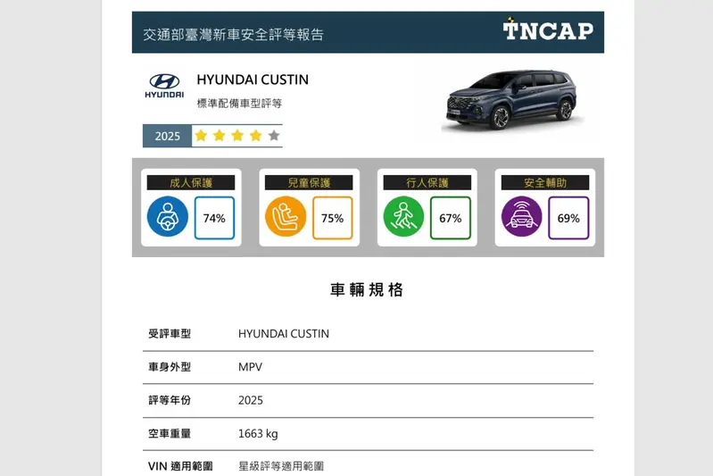 - 一、 HYUNDAI CUSTIN 於四大安全領域得分率中分別獲得成人 保護 74%、兒童保護 75%、行人保護 67%及安全輔助 69%, 依據星級評等平衡標準規定,CUSTIN 車型整體星級評等為 四顆星。