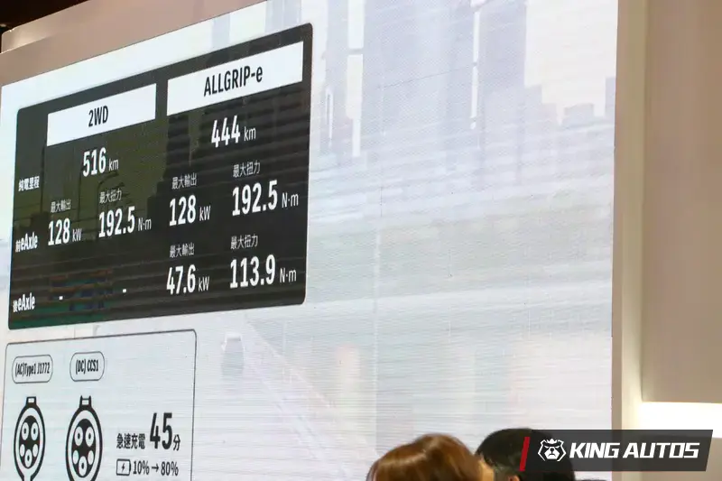e VITARA 採用 Suzuki 專為電動車開發的 HEARTECT-e 平台,並搭載高穩定性的LFP磷酸鋰鐵電池組。最高動力輸出達128 kW,ALLGRIP-e 四驅車型透過前後軸獨立 eAXLE 動力分配,驅動力較二驅版本提升 1.5 倍,確保在惡劣路面依然保有卓越的循跡性。根據NEDC測試,2WD 車型最高續航里程可達 516 公里,4WD 車型亦有 444 公里 的優異表現。充電方面,採用CCS1快充接口,僅需約 45 分鐘即可完成 10% 至 80% 的電量補給。