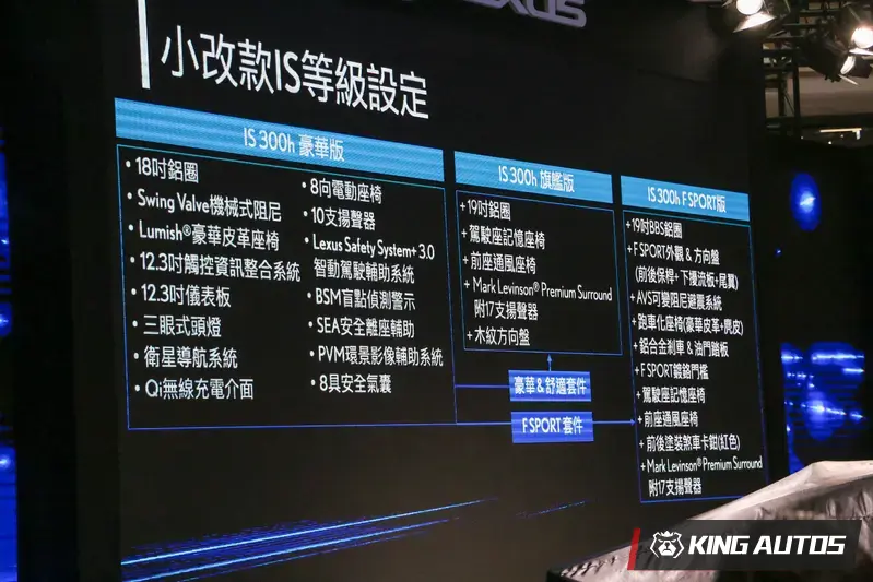 作為 Lexus 旗下最純粹的後驅運動房車,此次全新上市的 IS 車系(三度小改款)在「人車對話」的理念下,針對視覺張力與操駕極限進行了深度工程升級。車身比例更趨低重心與寬體化,搭配全新紡錘型水箱護罩設計。F SPORT 等級更標配 19 吋 BBS 輕量化鋁圈、專屬空力套件與紅色煞車卡鉗,強化侵略性。車內布局方面,導入12.3吋全數位儀表板與12.3吋中控觸控螢幕),並結合TAZUNA Concept 駕駛座艙設計。內裝首度採用Forged Bamboo鍛造竹紋飾板,將東方美學與現代樹脂工藝完美結合。搭載 2.5 升油電混合動力系統,具備 223 hp 綜效輸出。安全方面全面標配 Lexus Safety System+ 3.0與360度環景影像,提升防護層級。