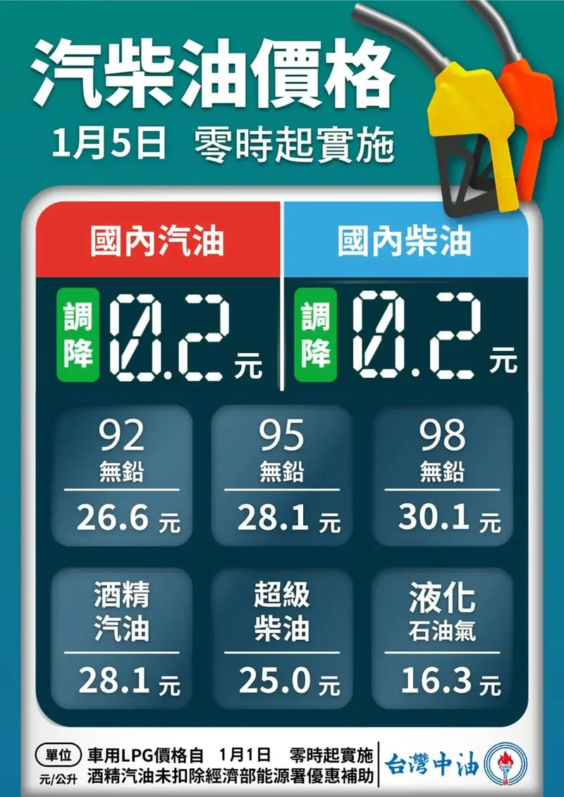 台灣中油公司自明(5)日凌晨零時起汽、柴油價格各調降0.2元,參考零售價格分別為92無鉛汽油每公升26.6元、95無鉛汽油每公升28.1元、98無鉛汽油每公升30.1元、超級柴油每公升25.0元。