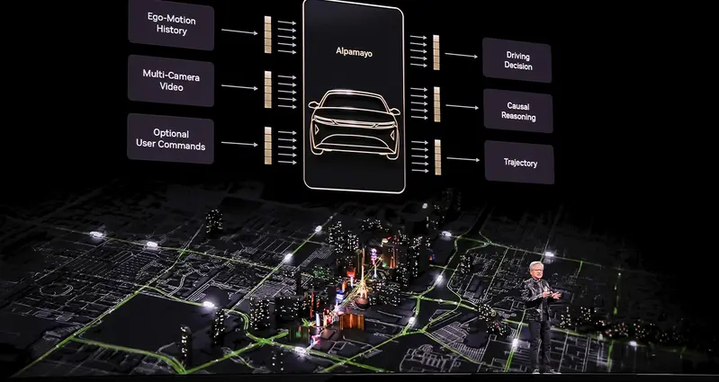 此次發表的核心在於 Alpamayo 1 模型。這款具備 100 億參數的思考鏈視覺語言行動模型,徹底顛覆自駕車的決策機制。過去的系統多基於規則或機率,難以應對罕見的極端案例。而搭載 Alpamayo 的賓士 CLA,現在具備了類似人類的推理能力。黃仁勳在現場舉例,當車輛駛入一個交通號誌全面失效、路況極其混亂的繁忙路口時,Alpamayo 會將問題拆解成多個步驟,推演各種可能性,最終選出風險最低的行動路徑。這標誌著汽車從自動執行進化到了理解並解釋。