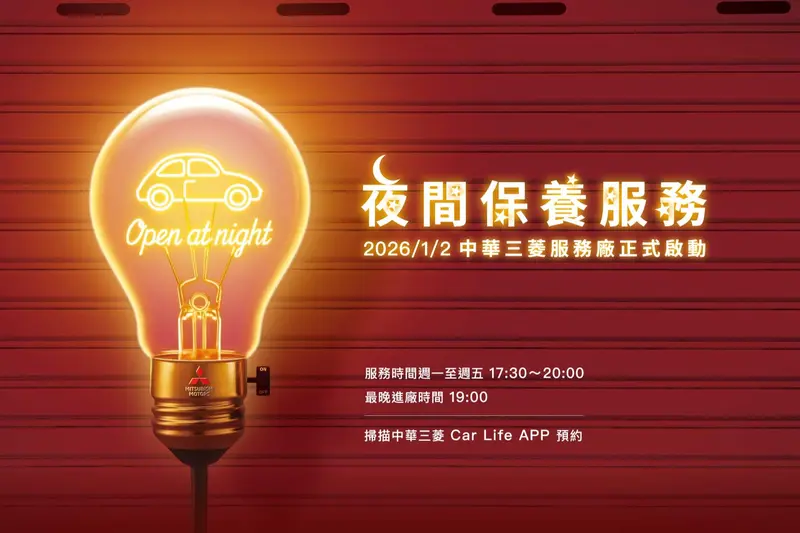 除了購車端大方回饋,中華三菱本月最具指指標性的動作即售後服務的轉型。自2026年1月2日起,官方正式啟動夜間保養服務。時間為週一至週五 17:30 – 20:00。解決上班族必須請假保養愛車的困擾,帶來下班後預約即保養的效率生活。該服務可透過中華三菱 Car Life APP快速線上預約(需於進廠前2天16:30前透過APP完成)。