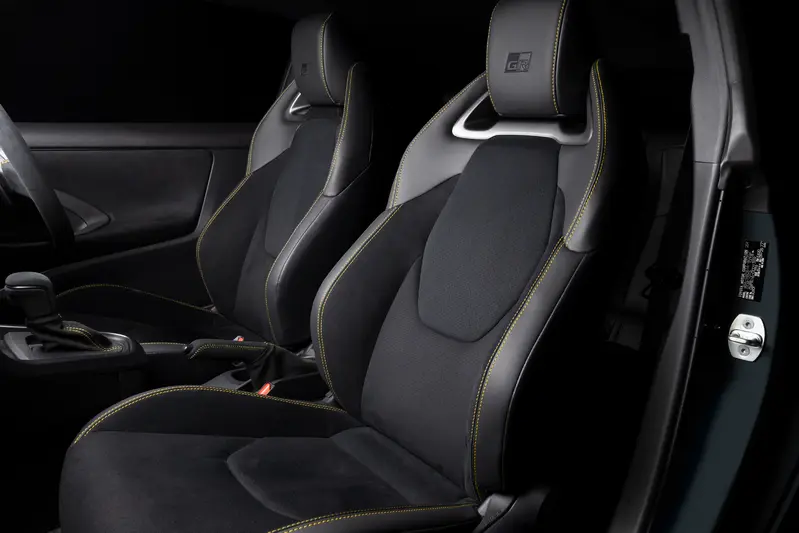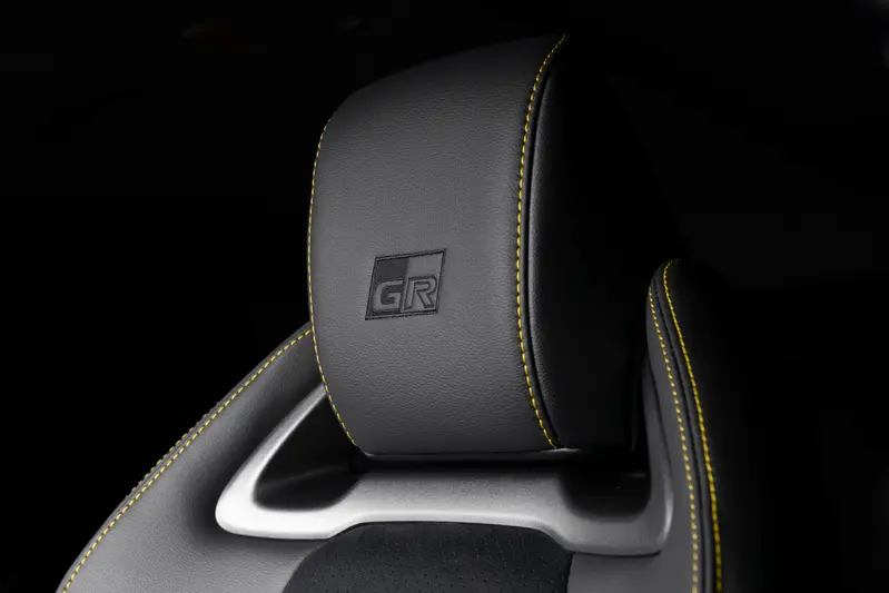 進入車內,戰鬥氛圍同樣濃郁。全車內裝以麂皮材質包覆,並輔以象徵 Morizo 的黃色車縫線。為了滿足極限駕駛需求,TGR 縮小了方向盤直徑,並參考 GR Yaris Rally2 賽車的經驗,將換檔撥片與方向盤控制按鍵進行了獨立佈局改良。數位儀表板也同步升級,不僅能顯示專屬的「MORIZO」模式資訊,副駕駛座前方更鑲嵌有專屬序列編號銘牌,印證其僅有 100 部(日本市場)的珍稀血統。
