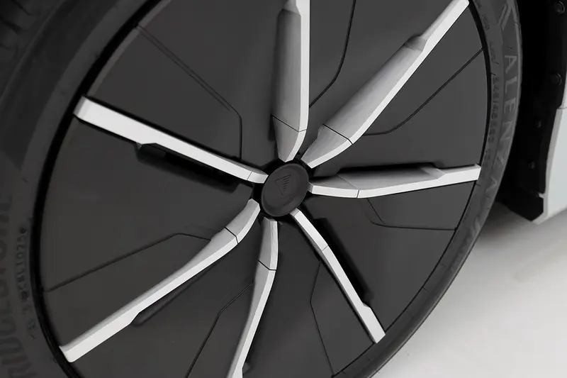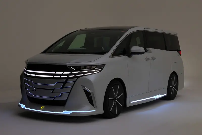 車頭部分,Modellista 徹底顛覆了現行 Alphard 的視覺印象。全新設計的 LED 燈組不僅僅是照明工具,更結合了數位藝術,創造出如同稜鏡般深邃且具有層次感的導光效果。這套燈光系統從格柵邊緣延伸至前保桿下緣,在黑暗中勾勒出極具未來感的輪廓,彷彿一輛穿梭於時空隧道中的飛行器。而專屬的輕量化大尺寸鋁圈,則透過精細的切削工藝,在靜止與行進間呈現出截然不同的光影律動。